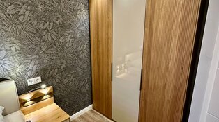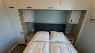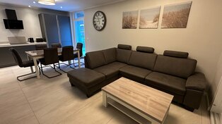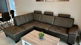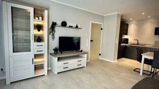 Im 30 m² großen Wohnbereich erwartet Sie eine designte, grifflose, offene Küche mit modernsten Siemens-Geräten, Kaffeevollautomat, hochwertiger Ausstattung, sowie ein lichtdurchflutetes Ambiente dank der großen Fensterfront und dem direkten Zugang zum Balkon. Italienische Designerfliesen im gesamten Wohn,- und Badbereich runden das Wohlfühlerlebnis ab. Auch die hochwertige gemütliche Schlaf-Couch lädt zum gemeinsamen Fernsehabend ein.
