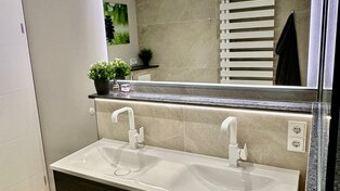 - Edle Villeroy & Boch und Hans Grohe Wellness-Armaturen im luxuriösen Bad mit stimmungsvoller Ambientenbeleuchtung und integriertem Radio