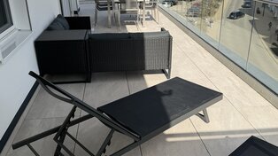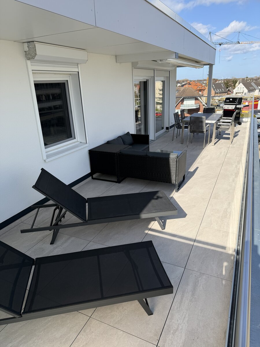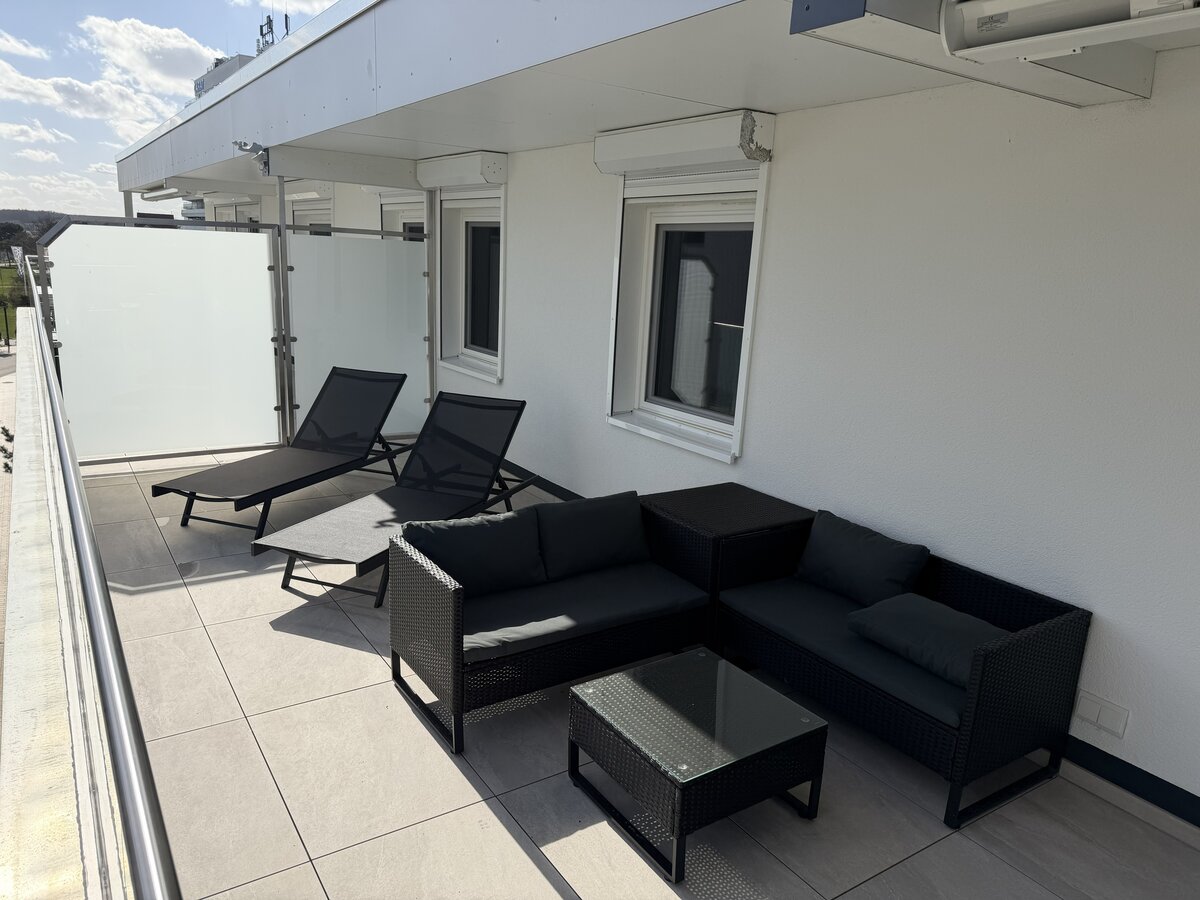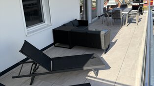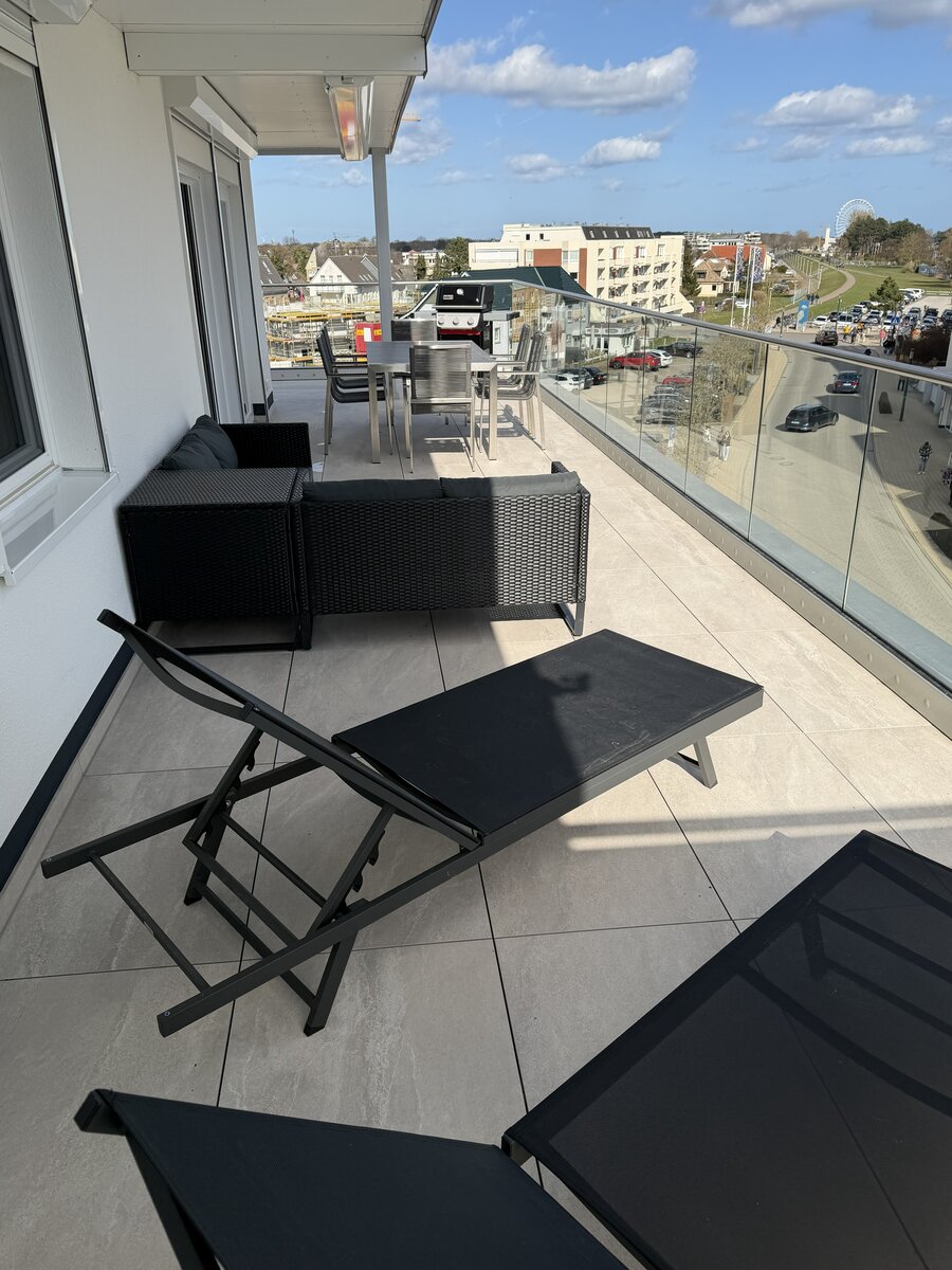 - Großer Nord-Ost-Südbalkon mit Meerblick, Sonnenliegen, Lounge und Esstisch