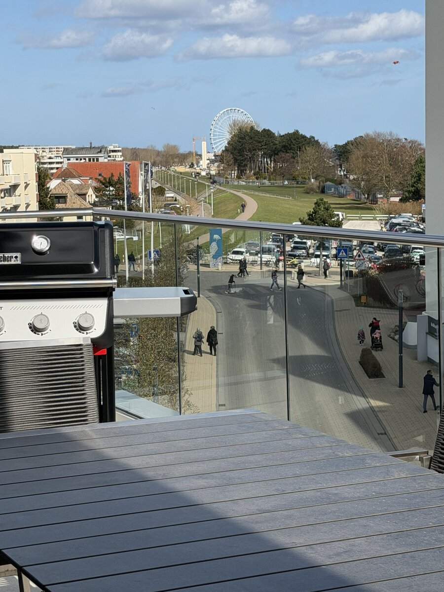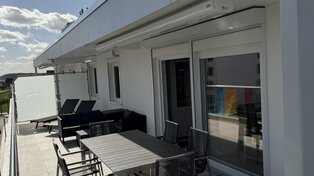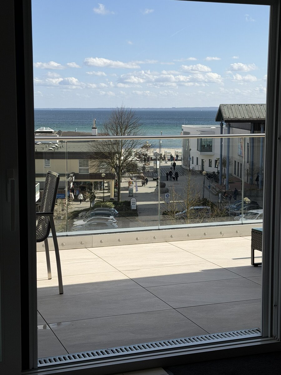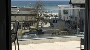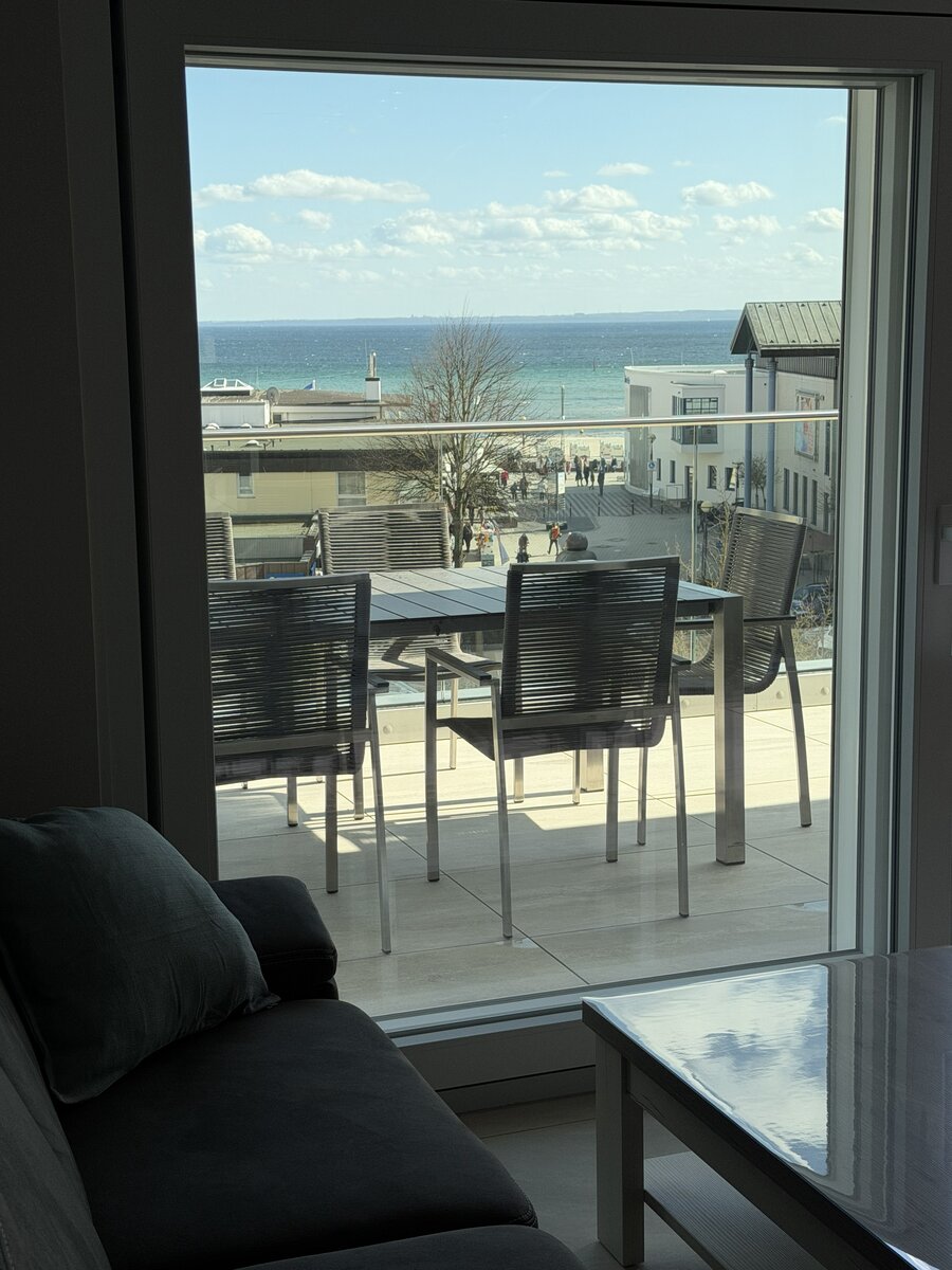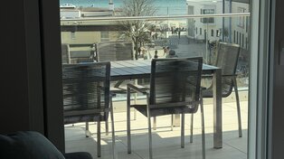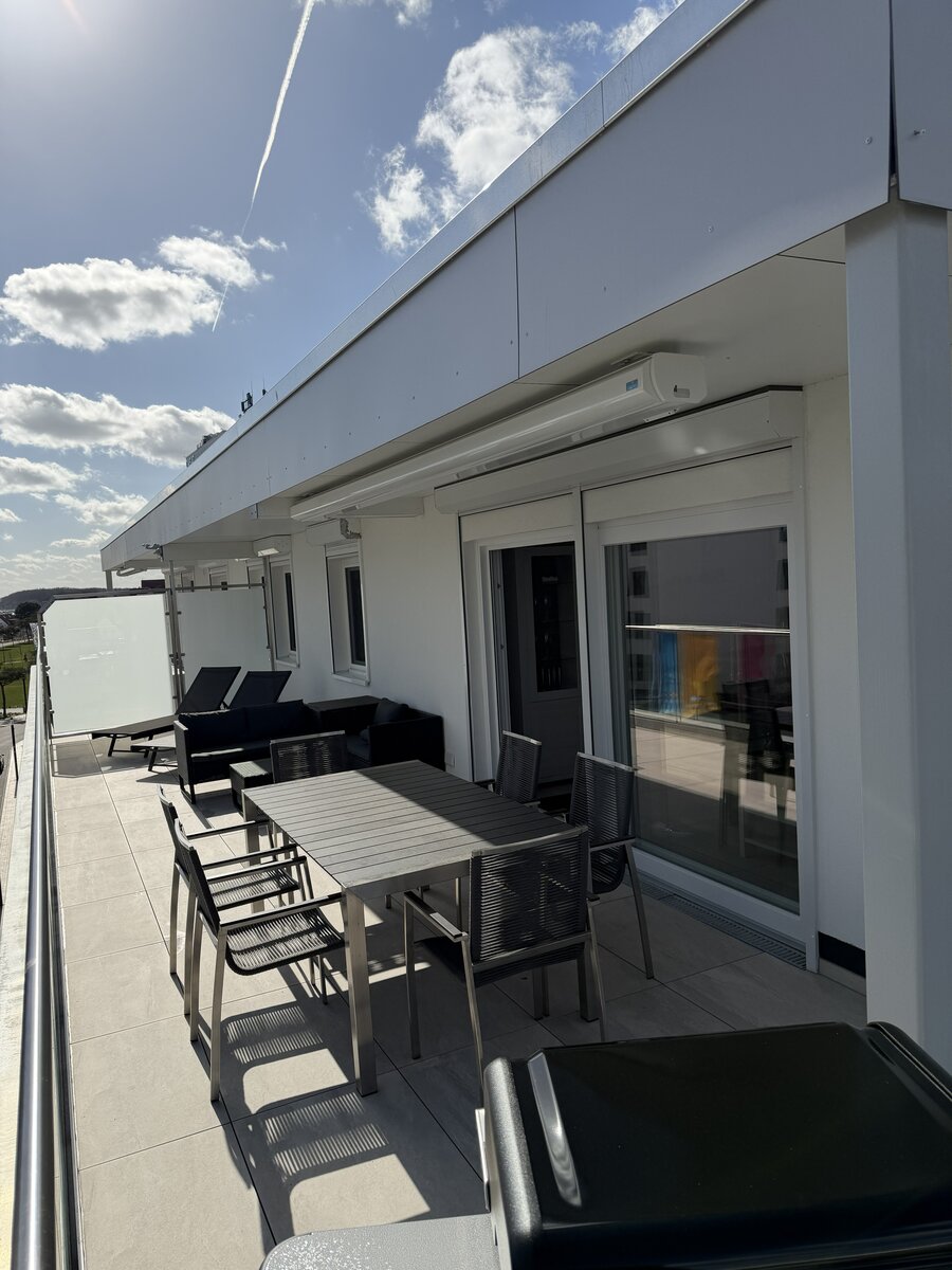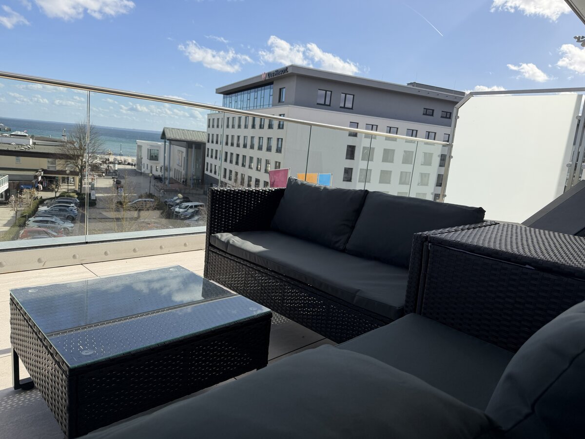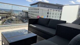 Auf dem weitläufigen Balkon können Sie den Tag auf bequemen Sonnenliegen oder der Lounge ausklingen lassen, am großen Esstisch unter der elektrischen Markise gemeinsam essen oder einfach den Tag über der Ostsee genießen.